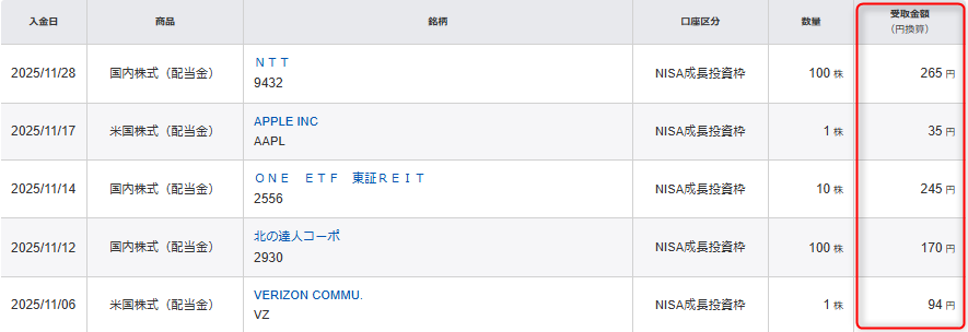 HOME > 日記 > 投資 > 投資 【2025年11月】配当金がでたので報告 2025年11月30日 Twitter Share Hatena LINE 楽天証券で買い付けた株の配当金がでたので今月も報告しようかと思います。 日本の個別株とETFです。 680円でした。 アメリカの個別株とETFです。 129円でした。 投資 Twitter Share Hatena LINE -投資