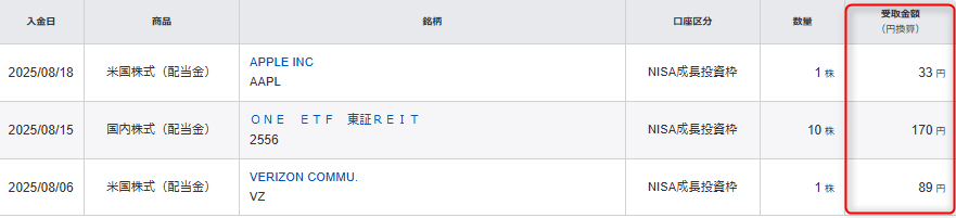 HOME > 日記 > 投資 > 投資 【2025年8月】配当金がでたので報告 2025年11月29日 Twitter Share Hatena LINE 楽天証券で買い付けた株の配当金がでたので今月も報告しようかと思います。 日本の個別株とETFです。 170円でした。 アメリカの個別株とETFです。 122円でした。 投資 Twitter Share Hatena LINE -投資